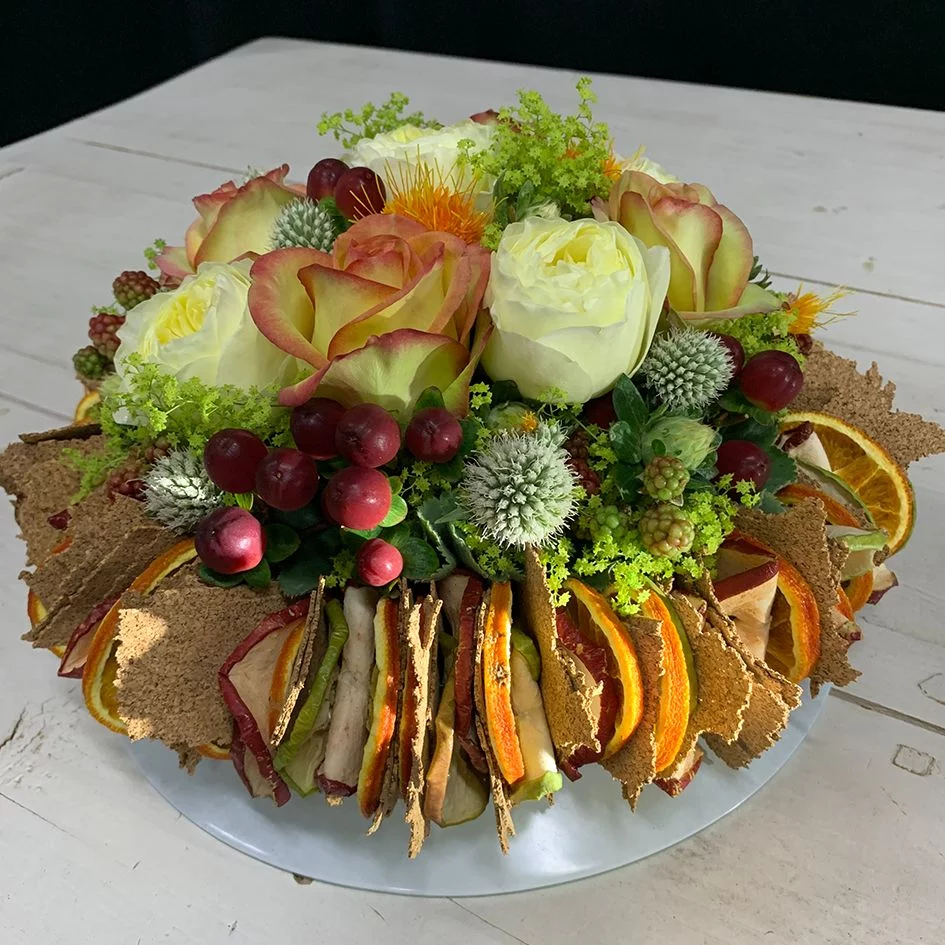 Zomerse creatie met gevriesdroogd fruit, kurk en seizoensbloemen,