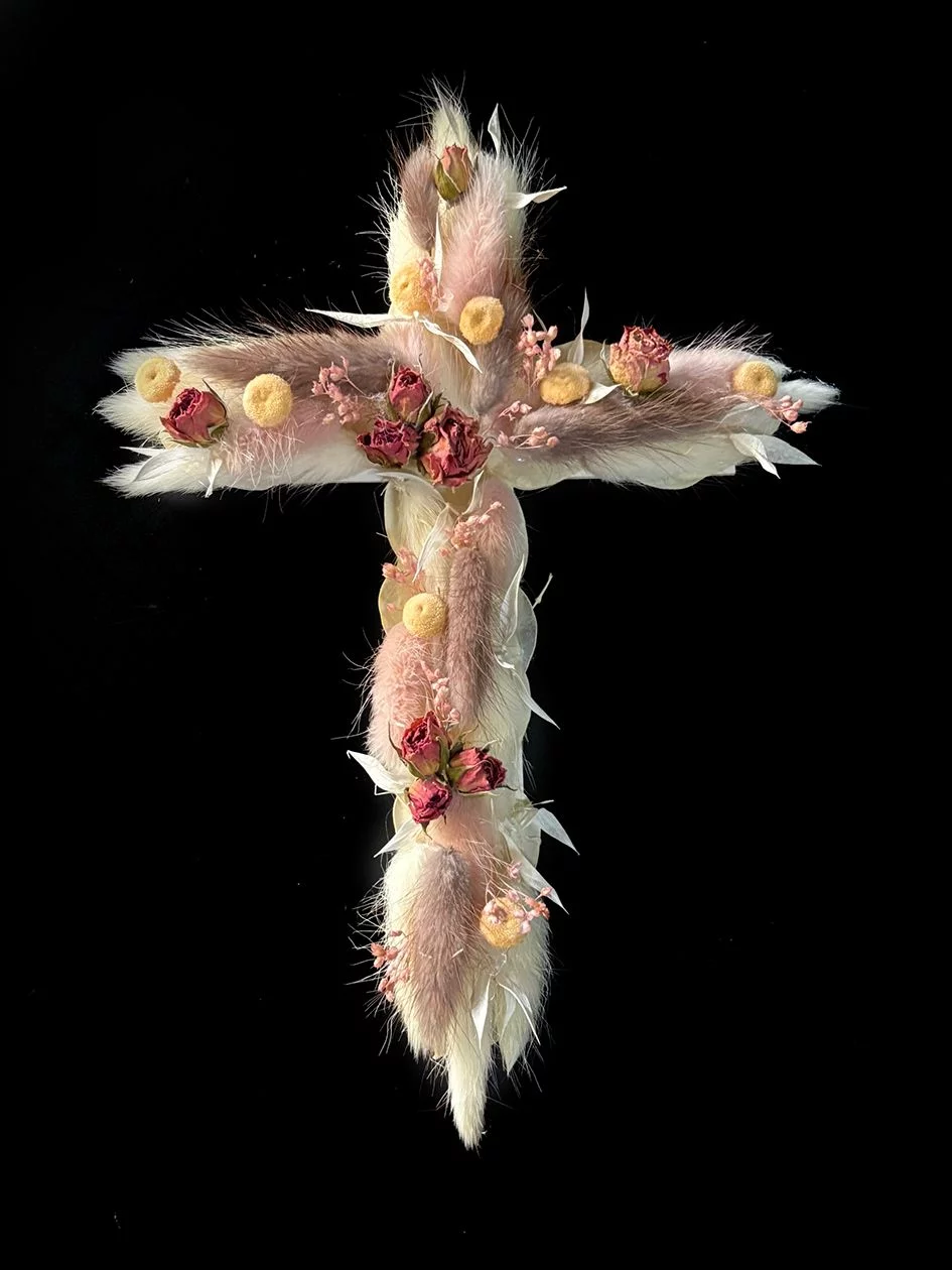 Kruisje met droogbloemen in oud-roze tinten 25cm